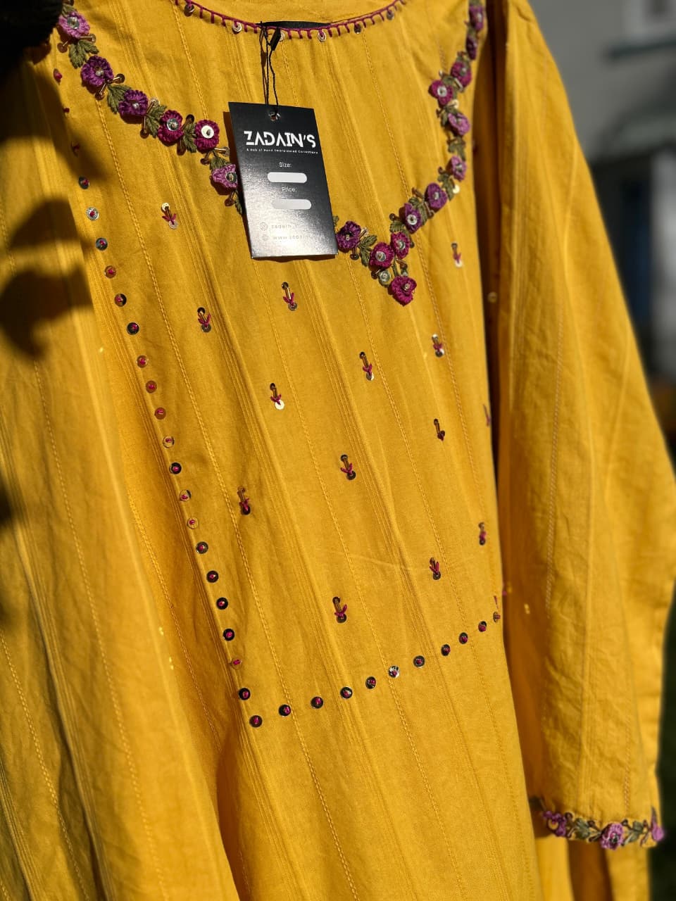 A bright and cheerful 2-piece mustard suit for kids, designed for both comfort and style. The kameez features subtle embroidery, paired with a matching shalwar for a complete traditional look. Perfect for daytime gatherings, festive occasions, or casual celebrations, keeping your little one stylish and comfortable.